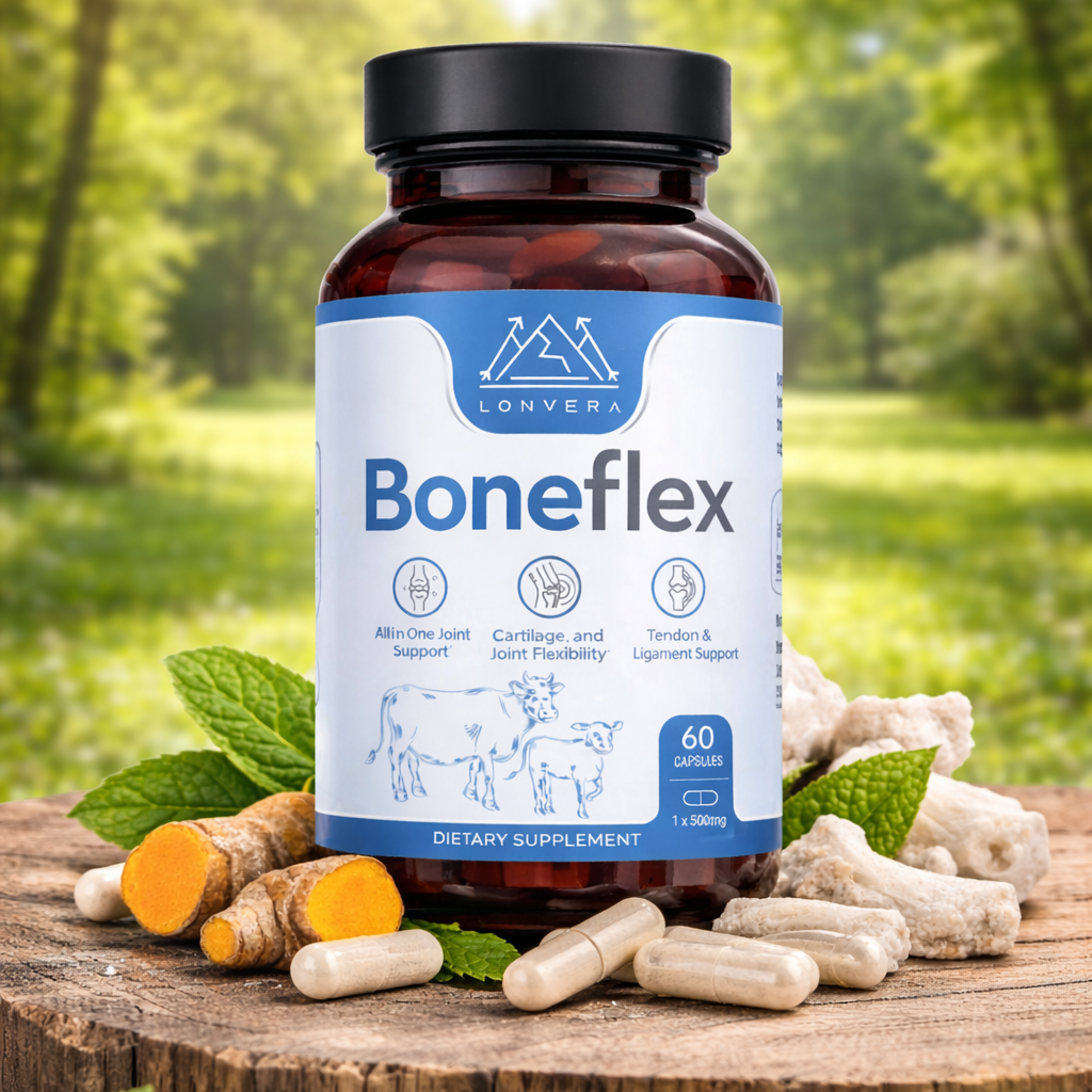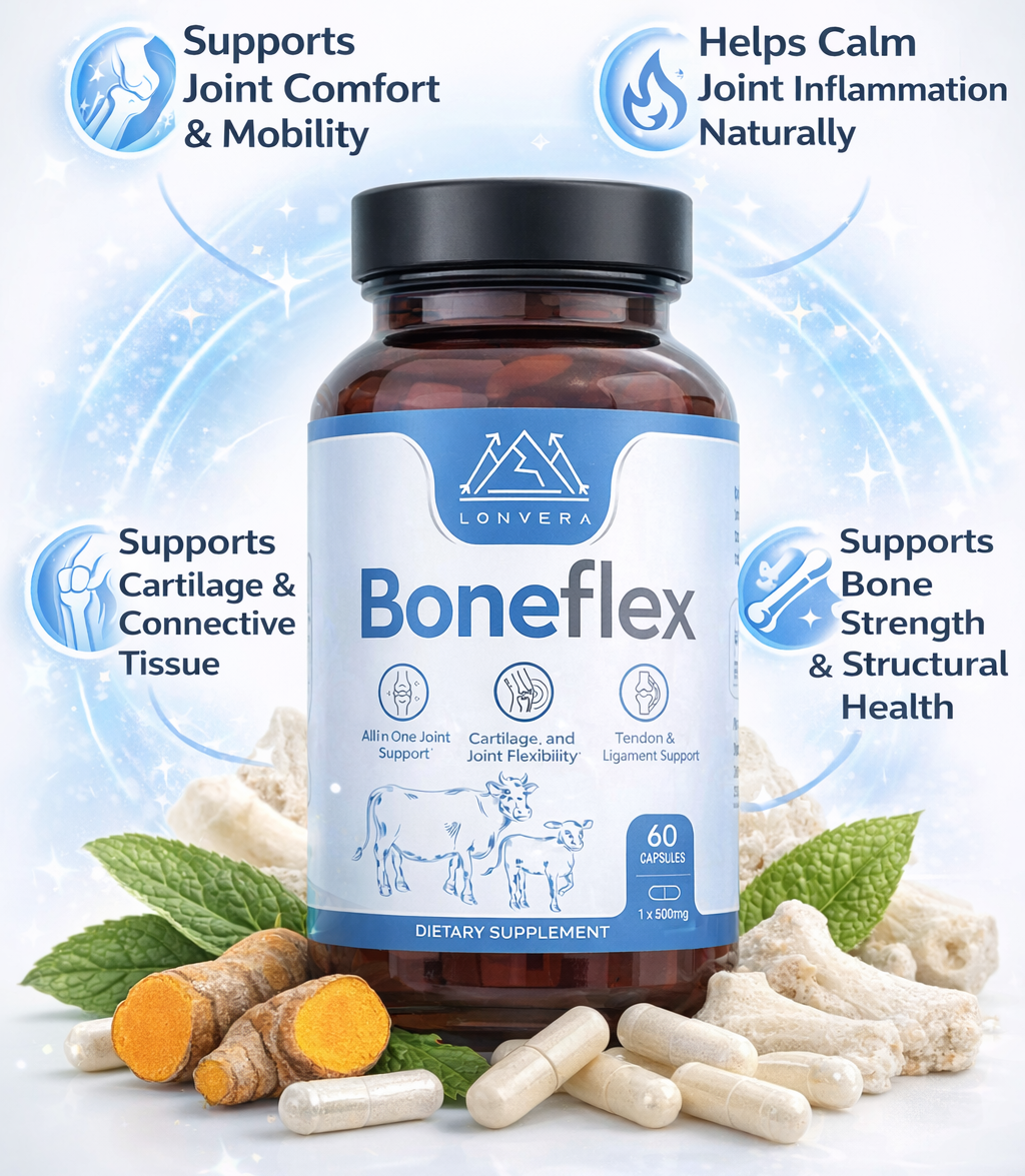 Boneflex is formulated with powerful, natural ingredients that help calm joint inflammation, support cartilage and connective tissue, and promote smooth, flexible movement. By nourishing your joints from within, Boneflex helps reduce stiffness, improve mobility, and support long-term joint and bone health—so you can stay active, comfortable, and confident in your everyday life.